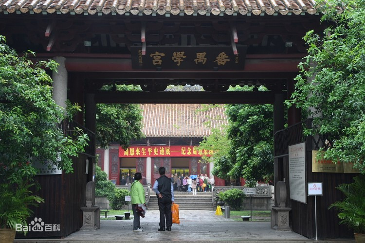番禺学宫位于广州市越秀区中山四路42号,现即毛泽东同志主办农民运动讲习所旧址。这里清代以前为番禺县县学和祭祀孔子的文庙(在承宣街,位今北京路之东,烈士陵园之西,属番禺县管辖)。明洪武三年(1370年),由知县毛忠、训导李昕始建。现在的格局形成于清乾隆十二年(1747年)。道光十五年重建。原学宫阔三路,深五进。现左右两路除尚存明伦堂、光霁堂外,大部分建筑已毁坏。中路现存棂星门、泮池拱桥、大成门、大成殿、崇圣殿及东西廊庑。占地5425平方米。主体建筑大成殿规模较大,面阔五间24.72米,进深14.22米,高12.62米。单檐歇山顶,黄琉璃瓦,抬梁式木结构。由于毛泽东同志于1926年在此举办农民运动讲习班,1953年这里被辟为农讲所旧址纪念馆,并被列为***重点文物保护单位。