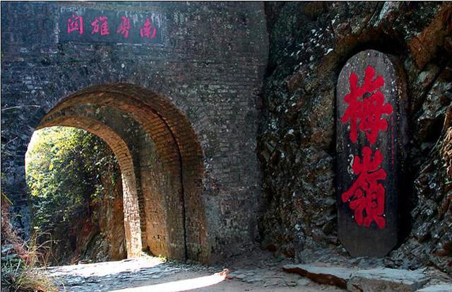 梅关关楼地处梅岭山巅,以"关隔断南北天"的气势,耸立于梅岭分水 界上,故有"一步跨二省"之说 。古时这里原没有关,先秦时梅,先秦时梅岭为楚之“枥门”,又叫"南戒门" 。秦始皇统一中国后,这里始设横浦关。旧址在今雄余公路上,人称小梅关。今残存的梅关关楼称大梅关。梅关古往今来都 是兵家必争之地,梅岭南北自古以来 是古战场,历史上许多英雄豪杰都在 这里留有战迹。近代孙中山领导的北 伐军二次入赣都是经过梅关,毛泽东、 朱德也曾率红四军攻占梅岭,彭德怀率红五军团与白军在这里相持 后与红一军团汇合组织厂著名的水口战 役,在梅岭一带打败白军 20 个团的围剿。红军主力长征之后,陈毅、项英 从中央苏区突围,在这里建立了以梅岭为中心区域的游击根据地,坚持了三 年游击战争,陈毅写下了《登大庚岭》、《偷渡梅关》和《梅岭三章》等光 辉诗篇 。
